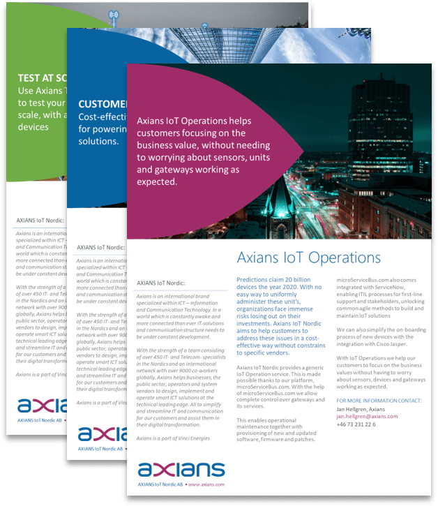 Axians AB is based in Stockholm, Sweden. Our team is divided between operations and development and together with our sister company Axians ICT and our partners we can offer you an end-to-end commitment of your IoT-operations.